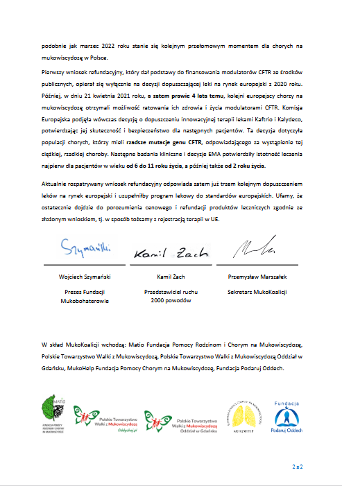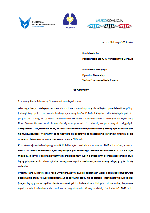 13 lutego 2025 r. organizacje zrzeszone w ramach MukoKoalicji: Polskie Towarzystwo Walki z Mukowiscydozą, Fundacja Pomocy Rodzinom i Chorym na Mukowiscydozę MATIO, Polskie Towarzystwo Walki z Mukowiscydozą oddział w Gdańsku, Fundacja Pomocy Chorym na Mukowiscydozę MUKOHELP oraz Fundacja Podaruj Oddech wspólnie z Fundacją Mukobohaterowie oraz Ruchem 2000 powodów wystąpiły z listem otwartym do Ministra Zdrowia i firmy Vertex z prośbą o jak najszybsze porozumienie i refundację leków przyczynowych, które są w stanie zmienić życie kolejnym grupom pacjentów. To już kolejny apel w tej sprawie. Liczymy na zrozumienie i zakończenie procesu refundacyjnego z sukcesem dla polskich chorych na mukowiscydozę.